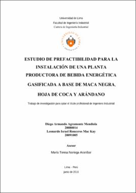 called “energy” drinks that are only stimulators; this alternative possesses health benefits and properties, apart from being a real energy drink, which guaranties a sustained energy release. La presente investigación es el estudio para la instalación de una planta productora de bebida energética gasificada, soft-drink refrescante hecho a base de maca negra, hoja de coca y arándano; recursos propios de las regiones peruanas de Junín, Cusco y La Libertad respectivamente. El producto constituye una alternativa saludable ante las mal llamadas bebidas “energizantes” que son solo estimulantes, esta alternativa posee propiedades y beneficios para la salud, además de ser un verdadero energético, el cual permitirá una liberación sostenida de energía.