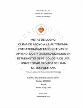 Diez Canseco Gómez, C. (2016). Metas de logro, clima de apoyo a la autonomía, estrategias metacognitivas de aprendizaje y desorganización en estudiantes de psicología de una universidad privada de Lima Metropolitana (tesis para optar el título profesional de Licenciada en Psicología). Universidad de Lima.Editor