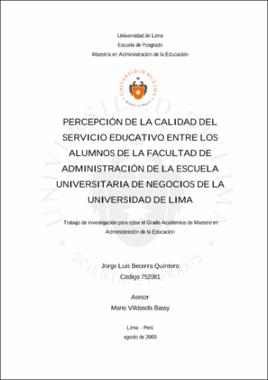 La presente investigación pretende analizar la percepción que tiene el alumnado de la Facultad de Administración de la Escuela Universitaria de Negocios de la Universidad de Lima con relación a la Calidad del Servicio Educativo que recibe, considerando para ello un marco referencial que sintetice: Planteamientos teóricos vinculados a la