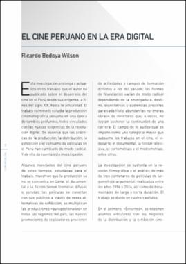 digital. Se observa que las prácticas de la producción, la distribución, la exhibición y el consumo de películas en el Perú han cambiado de modo radical. Y de ello da cuenta esta investigación. Esta investigación prolonga y actualiza otros trabajos que el autor ha publicado sobre el desarrollo del cine en el Perú desde sus orígenes, a fines del siglo XIX, hasta la actualidad. El trabajo culminado estudia la producción cinematográfica peruana en una época de cambios profundos, todos vinculados con las nuevas exigencias de la revolución