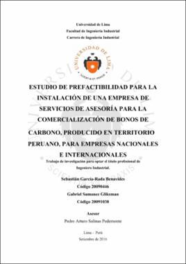 This research project aims to analyze the technical, economic, financial and market feasibility for the installation of a consulting services company, which will commercialize carbon offsets produced in Peru with national and international organizations. The aforementioned company will act as a broker between environmentally responsible projects and companies wishing to invest in them, charging a fee for each bond traded; thus, may encourage investment in new developments and contribute to reducing the carbon footprint of industrial and commercial activities, in pursuit for sustainable development. El presente proyecto de investigación pretende analizar la viabilidad técnica, económica, financiera y de mercado para la instalación de una empresa de servicios de asesoría para la comercialización de bonos de carbono producidos en territorio peruano, para empresas nacionales e internacionales. Dicha empresa, actuará como agente intermediario entre proyectos medioambientalmente responsables y empresas que deseen invertir en los mismos, cobrando una comisión por cada bono comercializado. De tal manera, se podrá fomentar la inversión en nuevos desarrollos y contribuir a la reducción de la huella de carbono que las actividades industriales y comerciales generan en el planeta, en búsqueda del desarrollo sostenible.