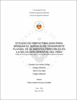This study proposes to launch a river transport service of perishables for oil companies in the northern jungle region , which for ms an important part of thebalanced diet that every worker should have .The main objective is to prov ide a continuous service all year. El presente estudio propone realizar un servicio de transporte fluvial de alimentos perecibles para las compañías petroleras de la selva norte del país, el cual forma parte importante dentro de la dieta balanceada que debe tener todo trabajador. El objetivo principal es brindar un servicio continúo durante toda época del año.