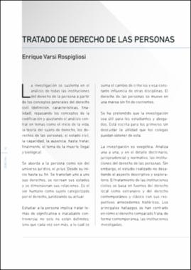 La investigación se sustenta en el análisis de todas las instituciones del derecho de la persona a partir de los conceptos generales del derecho civil (definición, características, finalidad), repasando los conceptos de la codificación y ajustando el análisis central en temas como el inicio de la vida, la teoría del sujeto de derecho, los derechos de las personas, el estado civil, la capacidad, la ausencia, hasta tratar, finalmente, el tema de la muerte (legal y biológica). La investigación se sustenta en el análisis de todas las instituciones del derecho de la persona a partir de los conceptos generales del derecho civil (definición, características, finalidad), repasando los conceptos de la codificación y ajustando el análisis central en temas como el inicio de la vida, la teoría del sujeto de derecho, los derechos de las personas, el estado civil, la capacidad, la ausencia, hasta tratar, finalmente, el tema de la muerte (legal y biológica).