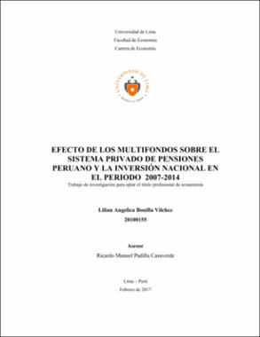 Bonilla-Vílchez, L.A. (2017). Efecto de los multifondos sobre el Sistema Privado de Pensiones peruano y la inversión nacional en el periodo 2007-2014 (Trabajo de investigación para optar el Título Profesional de Economista). Universidad de Lima.Editor