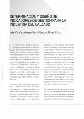 El objetivo central de la investigación fue establecer un diagnóstico de la industria del calzado en la ciudad de Lima, identificar las actividades clave de las áreas de producción y comercial, y determinar y diseñar los indicadores más adecuados que deben aplicarse en esta industria. El objetivo central de la investigación fue establecer un diagnóstico de la industria del calzado en la ciudad de Lima, identificar las actividades clave de las áreas de producción y comercial, y determinar y diseñar los indicadores más adecuados que deben aplicarse en esta industria.