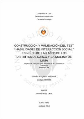 Abugattas Makhlouf, S. (2016). Construcción y validación del test "habilidades de interacción social" en niños de 3 a 6 años de los distritos de Surco y la Molina de Lima (trabajo de investigación para optar el título profesional de Licenciado en Psicología)Editor