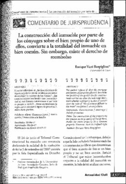 Varsi Rospigliosi, E. (2017). La construcción del inmueble por parte de los conyúges sobre el bien propio de uno de ellos, convierte a la totalidad del inmueble en bien común. Sin embargo, existe el derecho de reembolso: comentario de jurisprudencia. Actualidad Civil, (36), 111-116.Editor