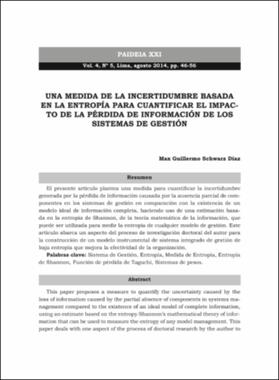 Schwarz-Díaz, M. G. (2014). Una medida de la incertidumbre basada en la entropía para cuantificar el impacto de la pérdida de información de los sistemas de gestión. Paideia XXI, 4 (5), 46-56.Editor