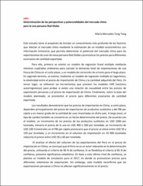 Este estudio tiene el propósito de brindar un conocimiento más profundo de los factores que afectan al mercado chino mediante la estimación de un modelo econométrico con información trimestral, que permita determinar el potencial del mercado chino para las exportaciones de uvas de mesa peruana Red Globe y pronosticar los precios para diferentes escenarios de cantidad exportada. Este estudio tiene el propósito de brindar un conocimiento más profundo de los factores que afectan al mercado chino mediante la estimación de un modelo econométrico con información trimestral, que permita determinar el potencial del mercado chino para las exportaciones de uvas de mesa peruana Red Globe y pronosticar los precios para diferentes escenarios de cantidad exportada.