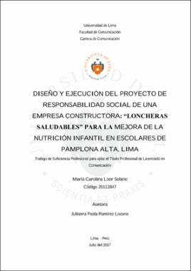 Loor Solano, M. C. (2017). Diseño y ejecución del proyecto de responsabilidad social de una empresa constructora: Loncheras saludables para la mejora de la nutrición infantil en escolares de Pamplona Alta, Lima (trabajo de suficiencia profesional para optar el título profesional de Licenciado en Comunicación). Universidad de Lima.Editor