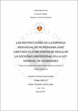 Sing Chumbe, A. F. (2017). Las restricciones de la empresa individual de responsabilidad limitada y la necesidad de regular la sociedad unipersonal en la Ley General de Sociedades [Trabajo de investigación para optar el grado académico de Maestro en Derecho Empresarial]. Repositorio Institucional de la Universidad de Lima. https://hdl.handle.net/20.500.12724/5702Editor