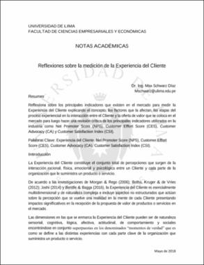 Schwarz Díaz, M. (2018). Reflexiones sobre la medición de la Experiencia del Cliente. Universidad de Lima, Facultad de Ciencias Empresariales y Económicas.Editor