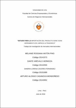 Antón Pino, M. R., Arévalo Hermoza, D., Cáceres Fernández, S. L. y Casanova Mondoñedo, A. A. (2018). Estudio para la importación del producto Sonic Soak: herramienta de limpieza ultrasónica [trabajo de fin de curso]. Universidad de Lima, Facultad de Ciencias Económicas y Empresariales, Carrera de Negocios InternacionalesEditor