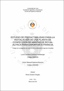 Córdova Haimberger, L. C. y Espinosa Becerra, V. M. (2018). Estudio de prefactibilidad para la instalación de una planta de confección de mantas de Royal Alpaca para exportar a Francia (trabajo de investigación para optar el título profesional de Ingeniero Industrial). Universidad de Lima.Editor