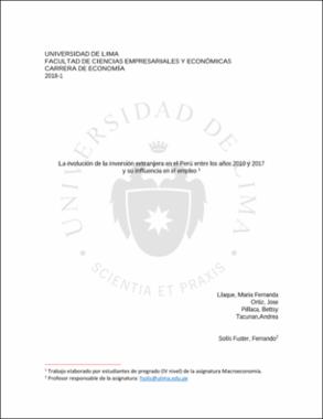 Llaque, M., Ortiz, J., Pillaca, B. y Tacunan, A. (2018). La evolución de la inversión extranjera en el Perú entre los años 2010 y 2017 y su influencia en el empleo [trabajo de fin de curso]. Universidad de Lima, Facultad de Ciencias Empresariales y Económicas.Editor