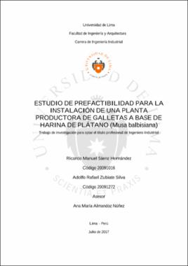 Sáenz Hernández, R. M. y Zubiate Silva, A. R. (2017). Estudio de prefactibilidad para la instalación de una planta productora de galletas a base de harina de plátano (Musa balbisiana) (trabajo de investigación para optar el título profesional de Ingeniero Industrial). Universidad de Lima.Editor