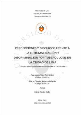 Pérez Fernández, A. L. y Soriano Gallardo, M. C. (2018). Percepciones y discursos frente a la estigmatización y discriminación por tuberculosis en la ciudad de Lima (tesis para optar el título profesional de Licenciado en Comunicación). Universidad de Lima.Editor