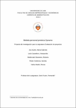 En el presente trabajo de investigación se demostrará el análisis de la viabilidad de un proyecto innovador creado por un equipo de trabajo de la Universidad de Lima. El producto innovador elegido para dicha investigación es una bebida proteica personal de nombre Dynamo. Esta consta de una botella PET reciclable con una capacidad de 250 ml de agua y 30 gramos de polvo proteico dentro de la tapa. Contara con dos sabores chocolate y cookes and cream. La forma en la que funciona este producto es un mecanismo que vierte el contenido del polvo que está en la tapa al agua y después se agita la botella hasta llegar a una textura de un “milkshake”. En el presente trabajo de investigación se demostrará el análisis de la viabilidad de un proyecto innovador creado por un equipo de trabajo de la Universidad de Lima. El producto innovador elegido para dicha investigación es una bebida proteica personal de nombre Dynamo. Esta consta de una botella PET reciclable con una capacidad de 250 ml de agua y 30 gramos de polvo proteico dentro de la tapa. Contara con dos sabores chocolate y cookes and cream. La forma en la que funciona este producto es un mecanismo que vierte el contenido del polvo que está en la tapa al agua y después se agita la botella hasta llegar a una textura de un “milkshake”.