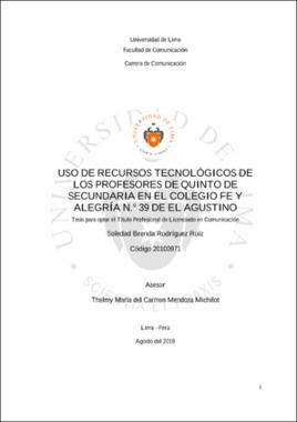 Rodríguez Ruiz, S. B. (2018). Uso de recursos tecnológicos de los profesores de quinto de secundaria en el colegio Fe y Alegría n.° 39 de el Agustino (tesis para optar el título profesional de Licenciado en Comunicación). Universidad de Lima.Editor
