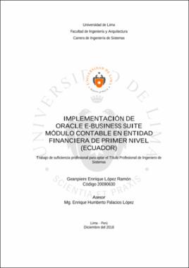 López Ramón, G. E. (2018). Implementación de Oracle E-Business Suite módulo contable en entidad financiera de primer nivel (Ecuador) [Trabajo de suficiencia profesional para optar el Título Profesional de Ingeniero de Sistemas, Universidad de Lima]. Repositorio institucional de la Universidad de Lima. https://hdl.handle.net/20.500.12724/8018Editor