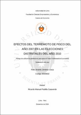 Jiménez Cieza, F. A. (2018). Efectos del terremoto de Pisco del año 2007 en las elecciones distritales del año 2010 (Trabajo de suficiencia profesional para optar el Título Profesional de Economista). Universidad de Lima.Editor