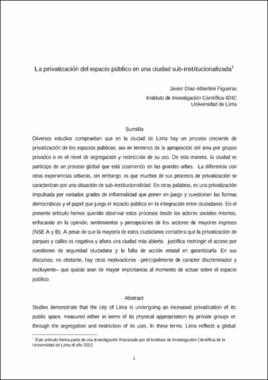 Diversos estudios comprueban que en la ciudad de Lima hay un proceso creciente de privatización de los espacios públicos, sea en términos de la apropiación del área por grupos privados o en el nivel de segregación y restricción de su uso. De esta manera, la ciudad es partícipe de un proceso global que está ocurriendo en las grandes urbes. La diferencia con otras experiencias urbanas, sin embargo, es que muchos de sus procesos de privatización se caracterizan por una situación de sub-institucionalidad. En otras palabras, es una privatización impulsada por variados grados de informalidad que ponen en juego y cuestionan las formas democráticas y el papel que juega el espacio público en la integración entre ciudadanos. En el presente artículo hemos querido observar estos procesos desde los actores sociales mismos, enfocando en la opinión, sentimientos y percepciones de los sectores de mayores ingresos (NSE A y B). A pesar de que la mayoría de estos ciudadanos considera que la privatización de parques y calles es negativa y añora una ciudad más abierta, justifica restringir el acceso por cuestiones de seguridad ciudadana y la falta de acción estatal en garantizarla. En sus discursos, no obstante, hay otras motivaciones –principalmente de carácter discriminador y excluyente que quizás sean de mayor importancia al momento de actuar sobre el espacio público. Studies demonstrate that the city of Lima is undergoing an increased privatization of its public space, measured either in terms of its physical appropriation by private groups or through the segregation and restriction of its uses. In these terms, Lima reflects a global process that is occurring in most big cities. The difference with other urban experiences, however, is that many of the privatization processes are characterized by a situation of sub-institutionality. In other words, they are driven by various degrees of informality that openly challenge and question democratic forms and the role that public space plays in the integration of a diverse and heterogeneous citizenry. In the article, we dwell on how these processes are interpreted by the social actors themselves, focusing on the opinion, sentiments, and perceptions of higher income groups. Although a majority of these citizens consider that the privatization of parks and streets is negative and long for a more open city, they justify actions restricting access by claiming security issues and the lack of governmental action in deterring crime. Nonetheless, in their discourse, there are also other motivations –mainly of a discriminating and exclusionary character- that might be of greater importance at the moment they act on public space.