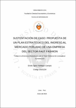 Yarleque Campos, E. O. (2019). Sustentación de caso: propuesta de un plan estratégico del ingreso al mercado peruano de una empresa del sector fast fashion (Trabajo de suficiencia profesional para optar el Título Profesional de Licenciado en Administración). Universidad de Lima.Editor