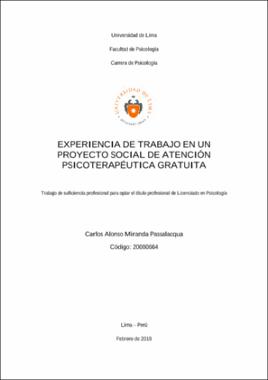 Miranda Passalacqua, C. A. (2019). Experiencia de trabajo en un proyecto social de atención psicoterapéutica gratuita (trabajo de suficiencia profesional para optar el título profesional de Licenciado en Psicología). Universidad de Lima.Editor