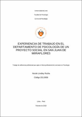 Lindley Rocha, N. (2019). Experiencia de trabajo en el departamento de psicología de un proyecto social en San Juan de Miraflores (trabajo de suficiencia profesional para optar el título profesional de Licenciado en Psicología). Universidad de Lima.Editor
