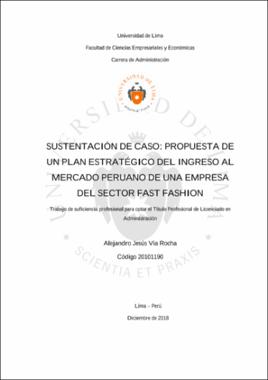 Via Rocha, A. J. (2018). Sustentación de caso: propuesta de un plan estratégico del ingreso al mercado peruano de una empresa del sector fast fashion (Trabajo de suficiencia profesional para optar el Título Profesional de Licenciado en Administración). Universidad de Lima.Editor
