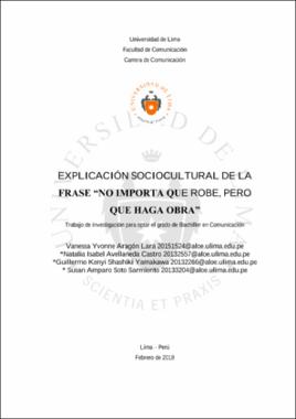 Aragón Lara, V. I. (2019). Explicación socio cultural de la frase "No importa que robe, pero que haga obra". [Trabajo de investigación para optar el grado académico de bachiller en Comunicación]. Repositorio Institucional de la Universidad de Lima. https://hdl.handle.net/20.500.12724/8471Editor