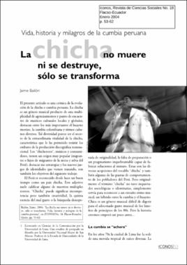 Bailón, J. (2004). La chicha no muere ni se destruye, sólo se transforma. Vida, historia y milagros de la cumbia peruana. Íconos: Revista de Ciencias Sociales, 18, 53-62. Recuperado de https://revistas.flacsoandes.edu.ec/iconos/article/view/3117/1999Editor