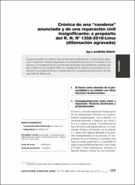 Alcántara Francia, O. A. (2019). Crónica de una “condena” anunciada y de una reparación civil insignificante: a propósito del R. N. N° 1358-2018-Lima (difamación agravada). Gaceta Penal & Procesal Penal, (118), 177-187.Editor