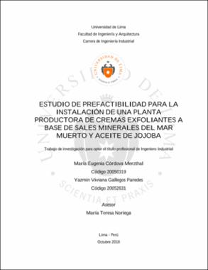 Córdova Merzthal, M. A. y Gallegos Paredes, Y. V. (2018). Estudio de prefactibilidad para la instalación de una planta productora de cremas exfoliantes a base de sales minerales del mar muerto y aceite de jojoba (trabajo de investigación para optar el título profesional de Ingeniero Industrial). Universidad de Lima.Editor