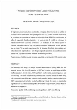 The purpose of this study is to analyze the main determinants of quality of life. For this purpose, we use data from 60 countries in 2017 and consider as explanatory variables traffic congestion, climate index, GDP, pollution, health, safety, purchasing power and cost of living. The model is estimated by Ordinary Least Squares. The results of this study call into question one of the most frequent beliefs regarding welfare, namely, that a higher GDP is associated with a higher level of well-being. Indeed, the results are statistically significant and have the expected sign for all variables except for GDP, whose effect on welfare is not significant. El objeto del presente estudio es analizar los principales determinantes de la calidad de vida. Para ello se toman datos de 60 países para el año 2017 y como variables explicativas se consideran la congestión del tránsito, el índice del clima, el PIB, la contaminación, la salud, la seguridad, el poder adquisitivo y el costo de vida. El modelo se estima por el método de Mínimos Cuadrados Ordinarios. Los resultados de este estudio ponen en cuestión una de las creencias más frecuentes con respecto al bienestar, aquella que dice que un mayor PIB se asocia a un mayor nivel de bienestar. En efecto, los resultados son estadísticamente significativos y con el signo esperado para todas las variables excepto para el PIB, cuyo efecto sobre el bienestar resulta no significativo.