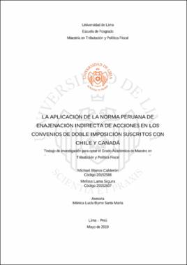 El presente trabajo de investigación trata la problemática referida a la aplicación de la norma con la que el Estado Peruano grava como rentas de fuente local las ganancias de capital originadas por la enajenación indirecta de acciones, en el marco de los convenios de doble imposición que suscribió con los Estados de Chile y Canadá.