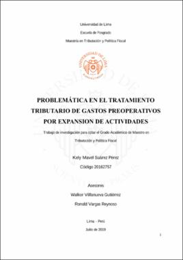Suárez Pérez, K. M. (2019). Problemática en el tratamiento tributario de gastos preoperativos por expansión de actividades [Trabajo de investigación para optar el grado académico de Maestro en Tributación y Política Fiscal]. Repositorio Institucional de la Universidad de Lima. https://hdl.handle.net/20.500.12724/9439Editor