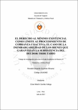 Guzmán-Álvarez, R. E. (2017). El derecho al mínimo existencial como límite al procedimiento de cobranza coactiva: el caso de la inembargabilidad de los bienes que garantizan la subsistencia del deudor tributario [Trabajo de Investigación para optar el Grado Académico de Maestro en Tributación y Política Fiscal]. Repositorio Institucional de la Universidad de Lima. https://hdl.handle.net/20.500.12724/9559Editor
